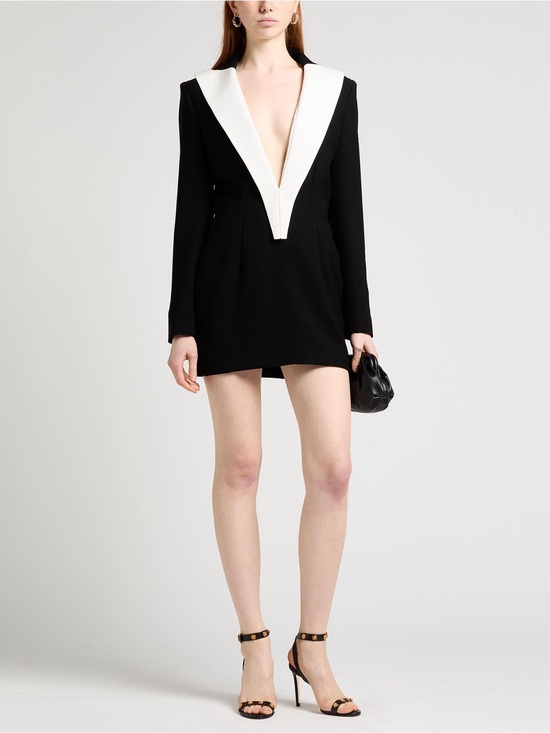 I am looking for this black plunge V-neck mini dress with a white contrast collar to wear for graduation. I want a long-sleeve, streamlined silhouette and the bold white deep V collar detail included.