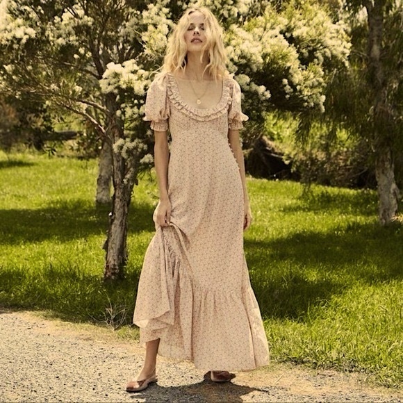 The Dôen Martha’s Garden dress is a sought-after feminine style known for its romantic silhouette and vintage-inspired details typical of the brand. The olive colorway is especially versatile for year-round wear and pairs easily with neutral accessories. Buyers often look for this piece due to its limited availability and distinctive Dôen aesthetic.