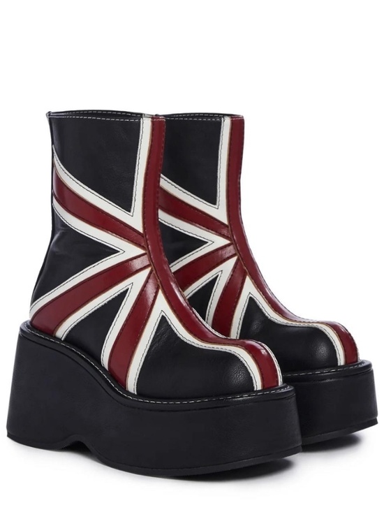 The Dolls Kill x Bratz collaboration features bold, Y2K-inspired statement footwear and apparel. The Union Jack platform boots are known for their high platform sole and eye-catching flag design, making them a standout collector-style piece from the collab. Buyers often seek them out due to their limited availability and distinctive Bratz-era aesthetic.