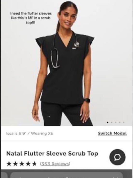 I am looking for FIGS scrub tops in black, preferably styles with flutter cap sleeves or a peplum silhouette. I want a sleek V-neck top that’s comfortable for long shifts and easy to layer.