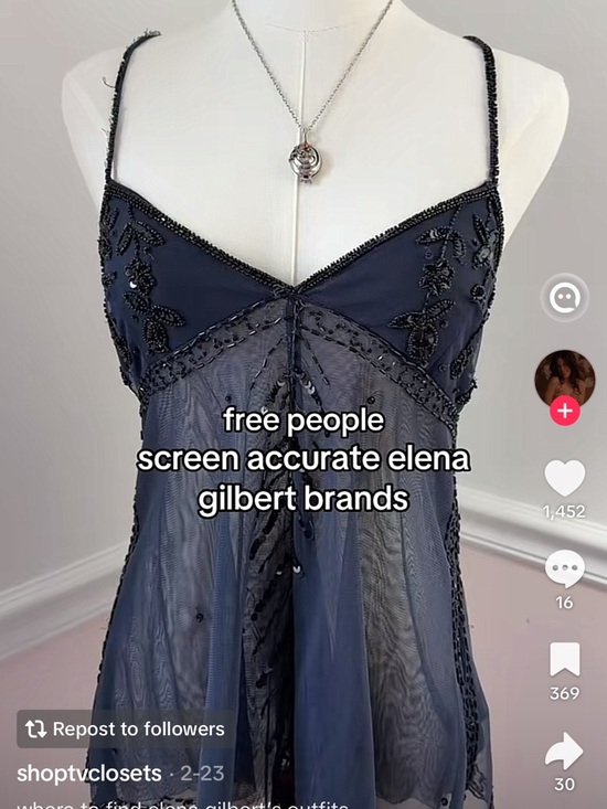 This Free People slip dress features delicate beadwork at the bodice with a soft, feminine silhouette. Sheer navy mesh panels extend from an empire seam for an airy, layered look, finished with thin spaghetti straps. The style is often sought after as an “as seen on” piece associated with Elena Gilbert.