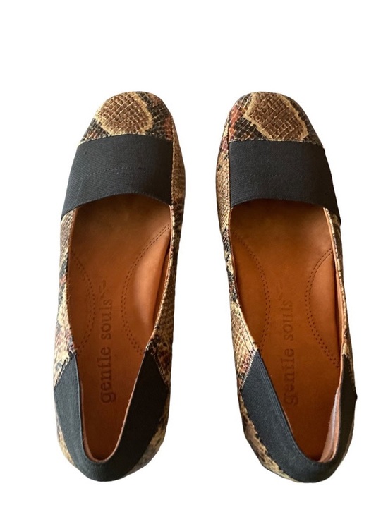 I am looking for Gentle Souls Kix Driving Moccasin snake-print ballet flats in size 8.5. I want the version with the black elastic strap, preferably in brown/tan tones and in excellent pre-owned condition.
