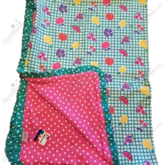 I am looking for the 1995 Gymboree “Picnic” line reversible baby blanket. It has a green grid with colorful fruit and floral motifs on one side, bright pink with white polka dots on the other, and a ruffled green trim border.