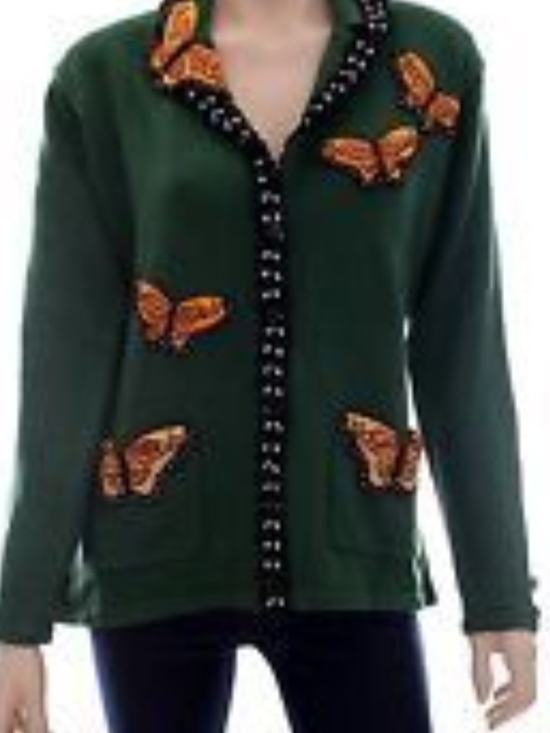 The HSN Storybook Knits “Monarchs Reign” is a vintage statement sweater featuring butterfly imagery and ruffle details. Pieces from this line are sought after for their bold, whimsical motifs and collectible vintage knitwear appeal. The request is specifically for the “Monarchs Reign” design, in green, with flexibility on sizing.