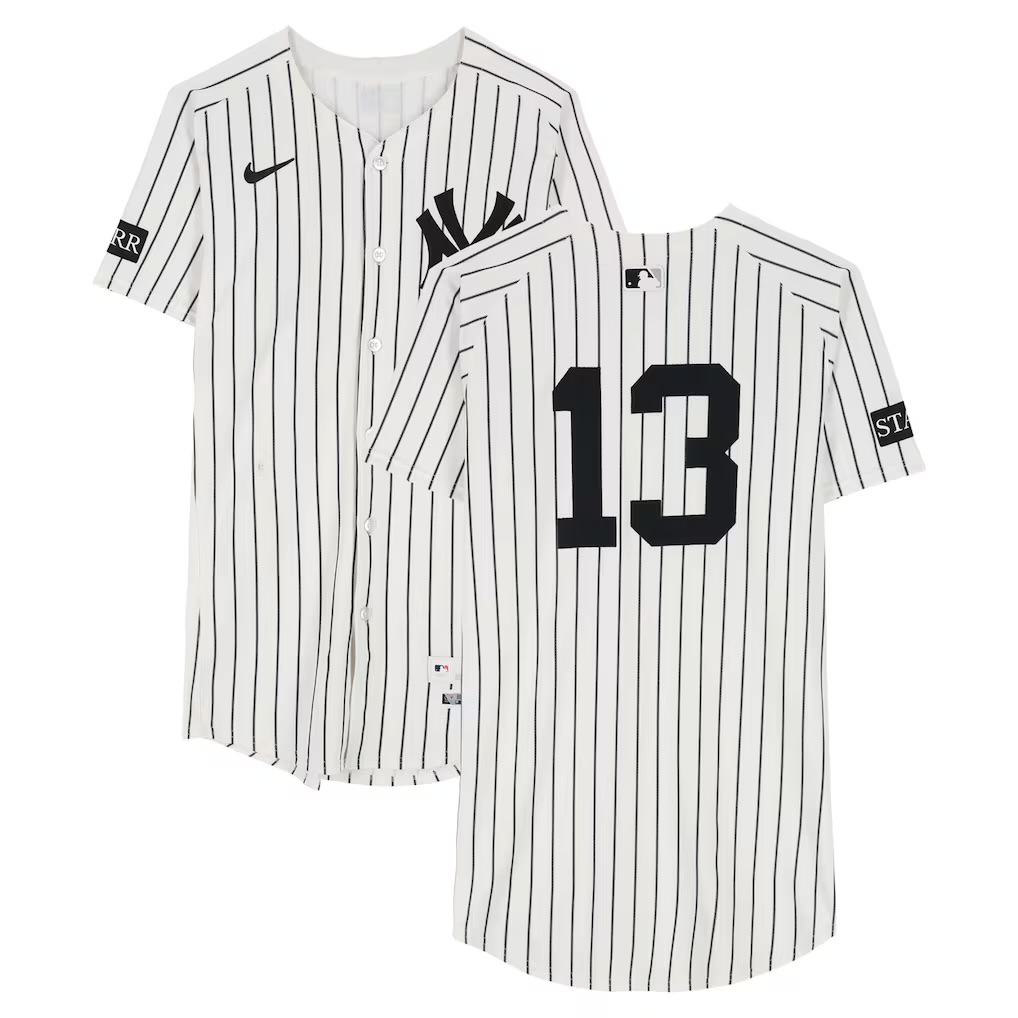 Looking for a Fanatics Authentic game-used New York Yankees home white pinstripe jersey worn by Jazz Chisholm Jr., number 13, in the game vs. the Baltimore Orioles on September 28, 2025. Nike-branded on-field style jersey with Yankees chest logo and MLB batterman at the back neck, ideally with authentication/provenance.