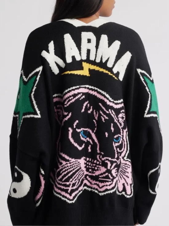 The MOTHER Karma Panther Oversize Cardigan is an oversized knit cardigan style known for relaxed layering and statement graphic detailing. MOTHER is a contemporary denim and ready-to-wear brand recognized for casual, elevated basics with a playful aesthetic. The black colorway makes it an easy-to-style piece for everyday outfits while still standing out as a distinctive sweater.