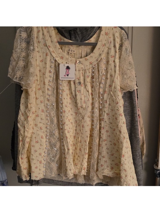 The requested item is a POL brand blouse/top featuring floral lace detailing and short sleeves in a cream colorway. Lace tops like this are typically sought for their delicate texture and versatile styling, pairing easily with denim or skirts for casual to dressy looks. The specific combination of cream color and floral lace makes it a standout, feminine piece.