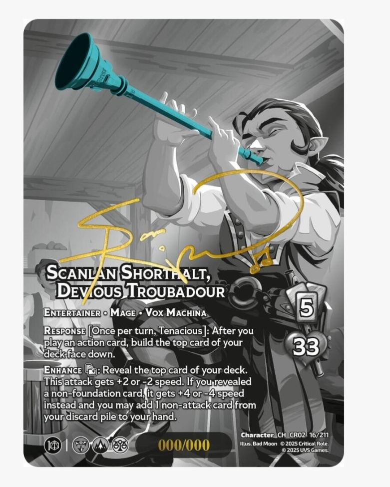 In search of the serialized (number-stamped) chase version of “Scanlan Shorthalt, Devious Troubadour” from Critical Role: Heroes of Exandria. Prefer clear photos of the serial stamp and front/back condition; graded or raw considered.