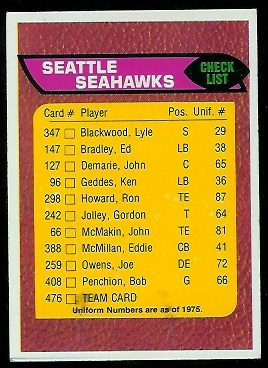 1976 Topps Seahawks Checklist PSA 10